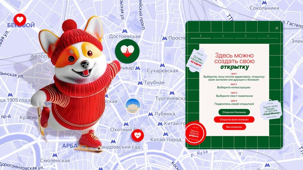Для того чтобы оставить свое пожелание на интерактивной карте, пользователю достаточно открыть страницу спецпроекта на портале «Узнай Москву», выбрать любимую площадку в столице и нажать на выбранное место на карте. После этого на экране появится предложение сгенерировать новогоднюю открытку с пожеланием. Адресовать ее можно как близким, так и всем жителям города. Затем можно выбрать изображение и текст поздравления из предложенных вариантов, каждый из которых связан с Москвой, ее жителями и любимыми героями. После нажатия на кнопку «Опубликовать» маскот проекта «Зима в Москве» — собачка породы корги — поможет установить сердечко на карте, а пользователь сможет поделиться своим сердечком и открыткой в соцсетях.